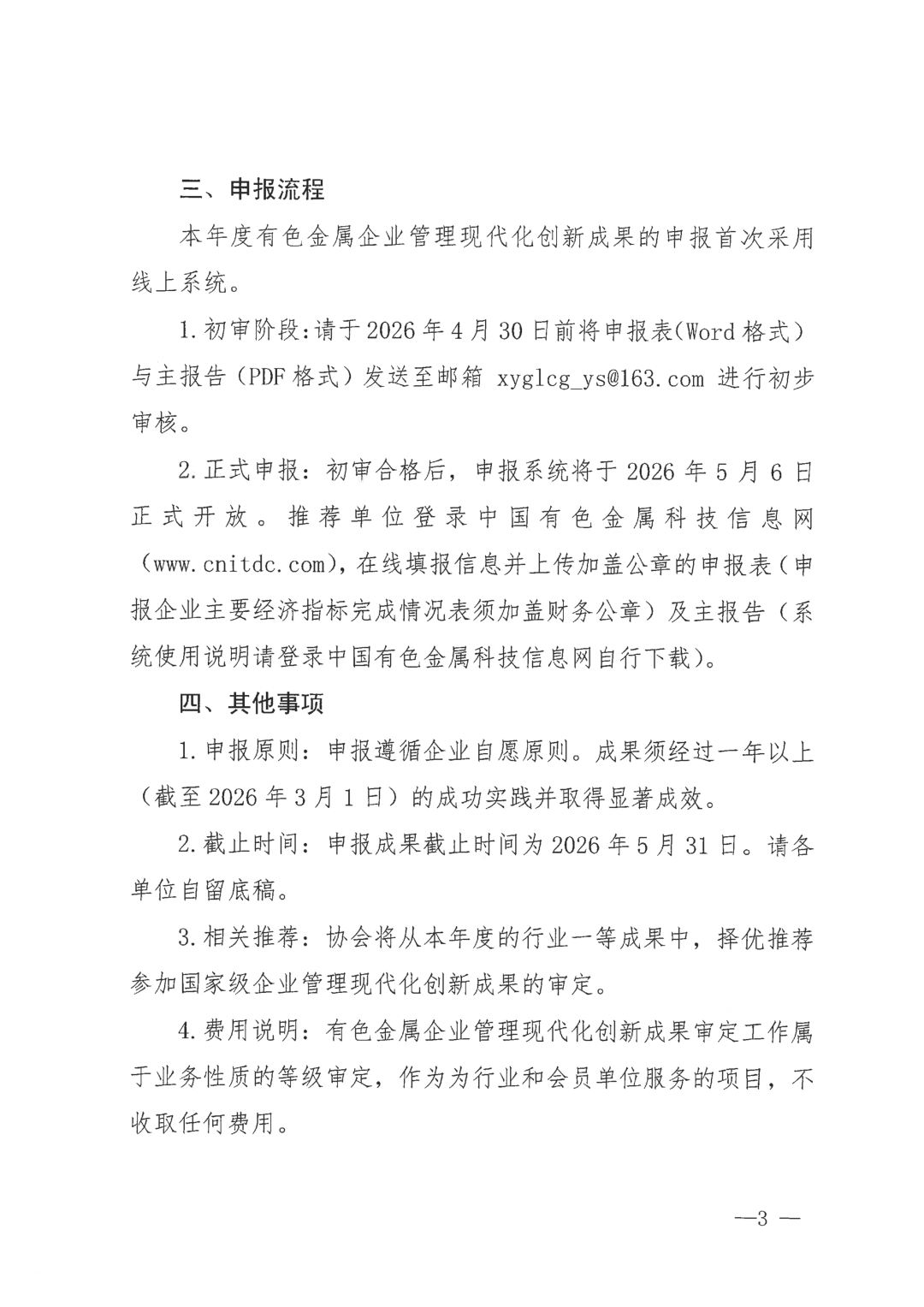 4.费用说明:有色金属企业管理现代化创新成果审定工作属于业务性质的等级审定,作为为行业和会员单位服务的项目,不收取任何费用。